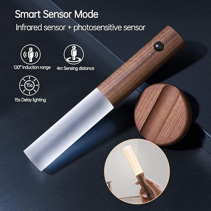 dual mode constant light mode and automatic lighting mode. automatic lighting modeautomatically turns on when a human motion within 13 feet is detected in a dark environment, and closes automatically after 15 seconds. If no movement is detected, the light will automatically go out when there is a light around. rechargeble built-in 500mAh rechargeable battery, lasts for maximum 8 hours in constant light mode and one month in automatic lighting mode. power saving no need to charge the baterry frequently when you use the automatic lighting mode. easy to install and hand-held portable. multiple usage scenarios bedside, drawers, cabinets, refrigerator doors, stairs, corridors,hallway,living room and so on. 4m Sensing distance, 120 Induction range. stick the base to flat surface to avoid it falling off.